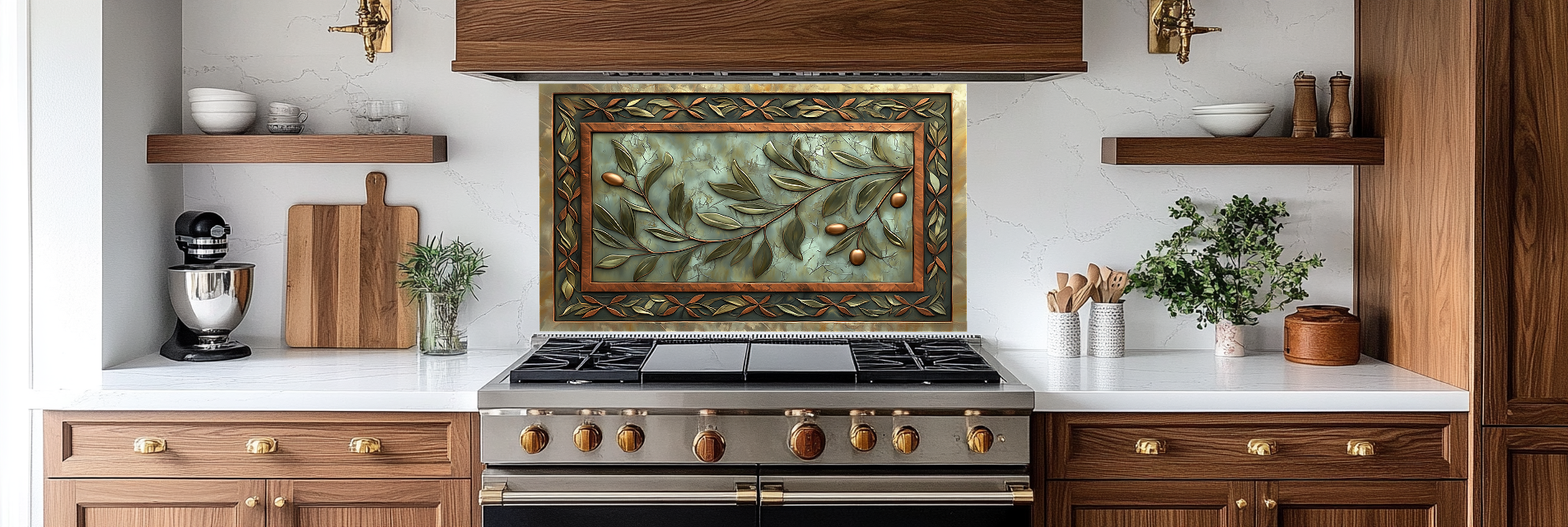 Copper Look Olive Branches One Piece Tempered Glass Kitchen Splashback For Stove Behind, Kitchen Backsplash, Wall Art