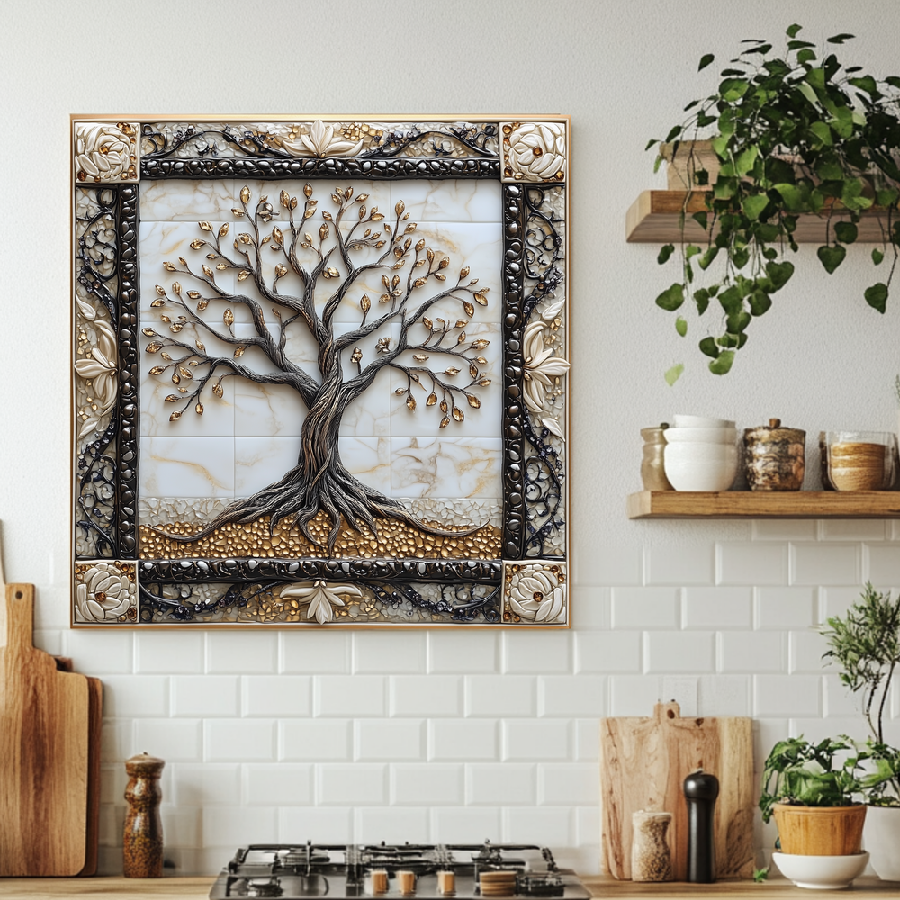 Attractive Life of Tree Framed Look One Piece Tempered Glass Kitchen Backsplash for Stove Behind, Kitchen Splashback, Glass Wall Art