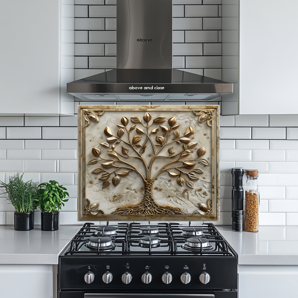 Stone Background Look Golden Tree of Life One Piece Tempered Glass Kitchen Splashback For Stove Behind, Kitchen Backsplash, Kitchen Backsplash, Wall Art