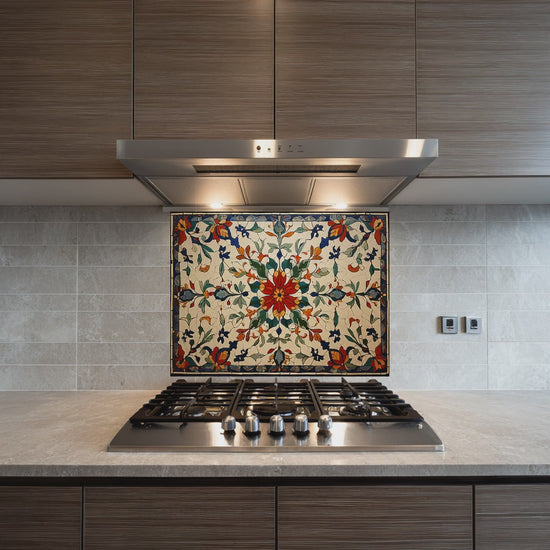 Red Ottoman Patterns One Piece Tempered Glass Kitchen Splashback For Stove Behind, Kitchen Backsplash, Kitchen Backsplash, Wall Art