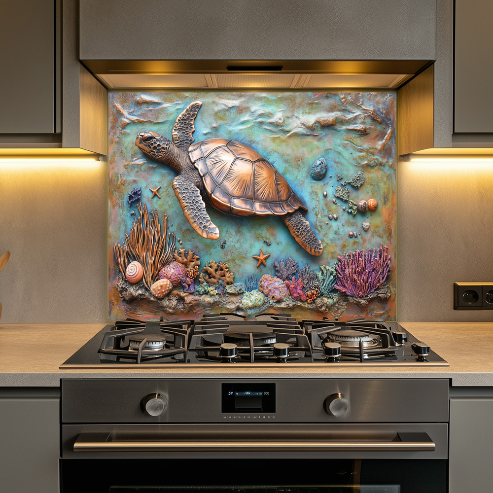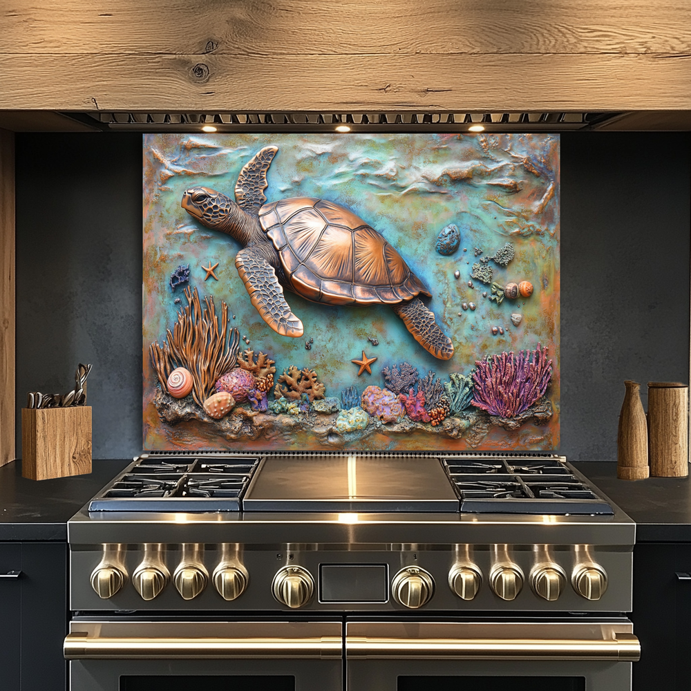 Copper Embossed Look Sea Turtle Glass Backsplash β’ Coastal Kitchen Panel β’ Artistic Ocean Texture β’ Nautical Decorative Panel
